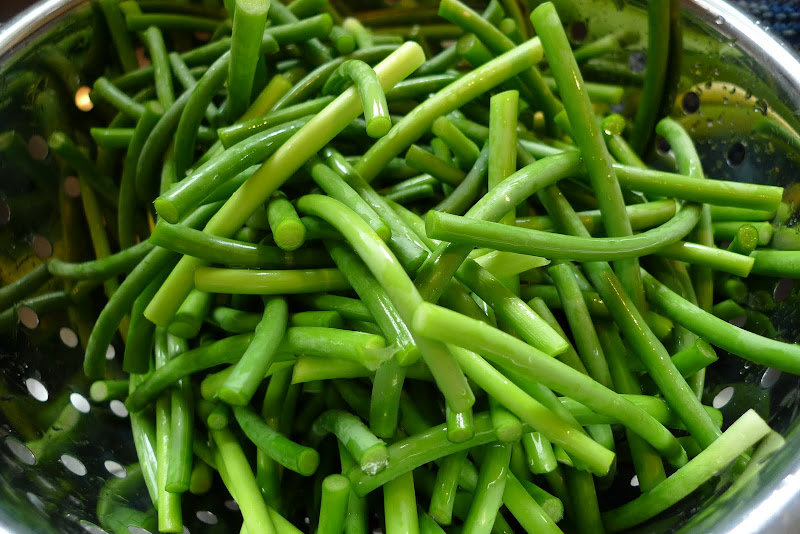 There was less glee involved during the prepping of the garlic scapes. I cut off 4″ pieces from the bottom of the garlic scape, stopping when the scape became tough. Most of the time I got two 4″ pieces from each scape, sometimes only one. I suppose I could have cut them up into 1-2″ pieces but I have a hard time changing plans when I set my mind to something,