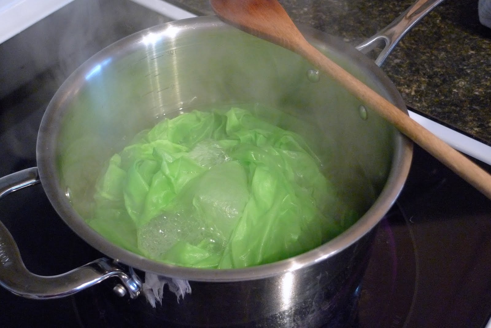 2. For one 36″ x 36″ silk, fill a sauce pan with 4 cups of water 1/2 cup of vinegar and two pouches of Kool Aid powder (same flavour). You can double or triple this to accommodate the size or number of silk you’ll be dyeing.