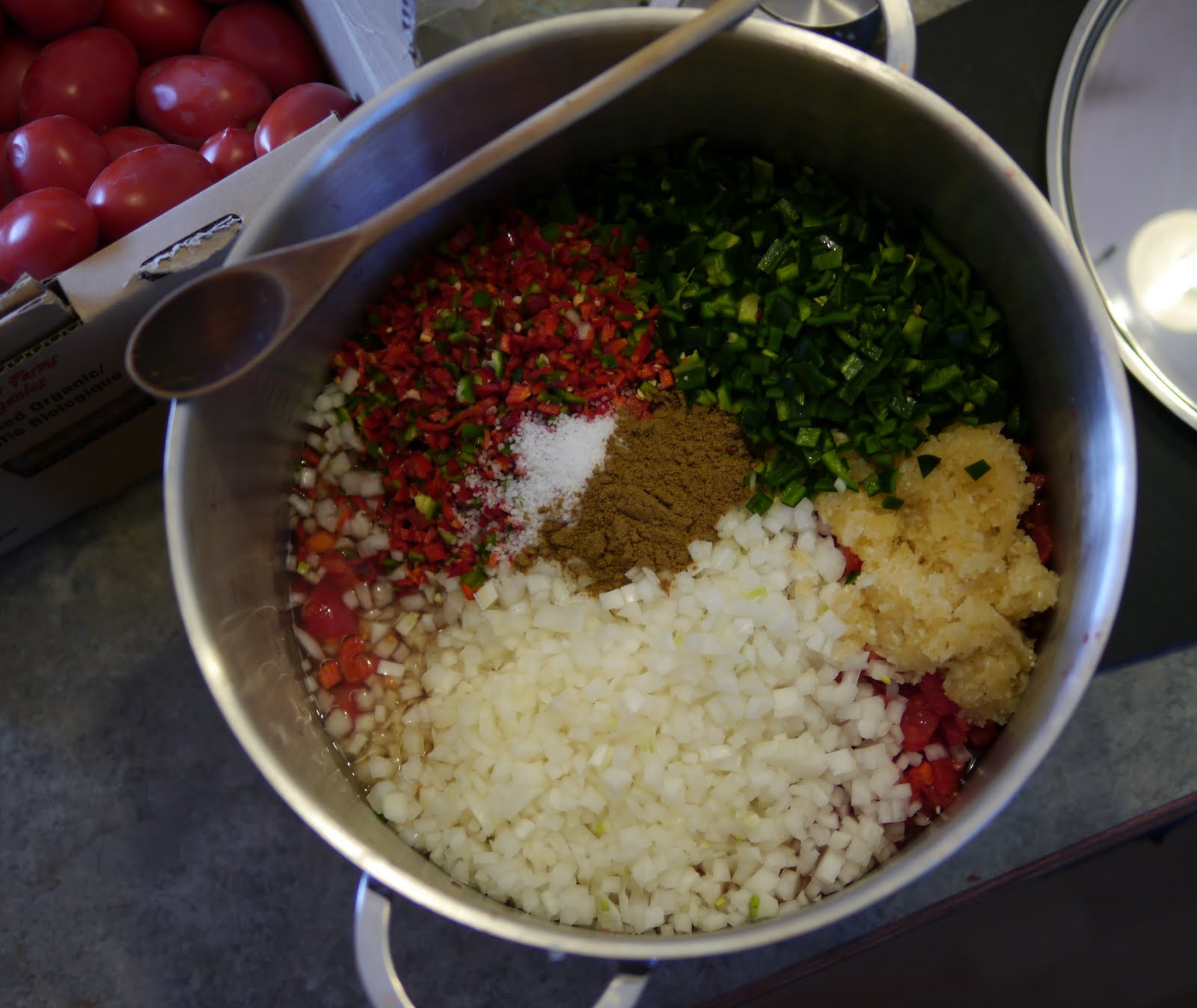 Salsa is a labour of love. It took me a full afternoon to make this salsa. The recipe is based on the Basic Red Salsa from Local Kitchen. The difference is that this recipe makes four times the amount and the quantities are listed in kilograms, pounds and grams. I prefer weighing things because it allows me to have consistent results every year. If you want cup measurements I have included them below as well.