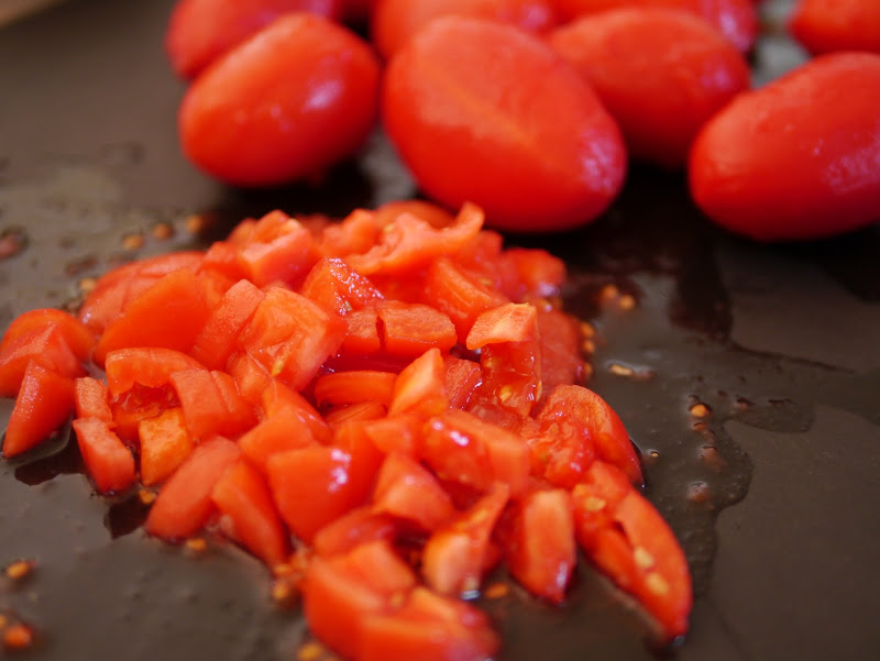 Start by peeling the tomatoes, if you want to. Boil a large pot of water and give the tomatoes a rinse. I learned a nifty trick from Well Preserved for getting the tomatoes skin to come off easily after blanching. Instead of marking an X at the bottom of the tomatoes, take a knife and mark up one side and then the other side of the tomatoes. A serrated knife works well. Boil the tomatoes, in batches, for 30-60 seconds, and then plunge them into a sink or pot of cold water. Peel away the skins. They should slip off easily.