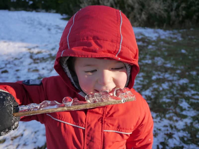 A stroll down to the beach on a winter’s day led to the discovery of various ice formations along the water’s edge. Unique ice structures encased sticks that had floated ashore and my eldest imagined them to be various object. Here he is testing out his new ice toothbrush.