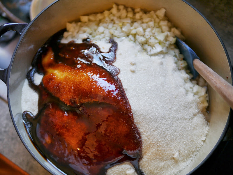 Chop rhubarb and onions and place into a large heavy bottomed pot.