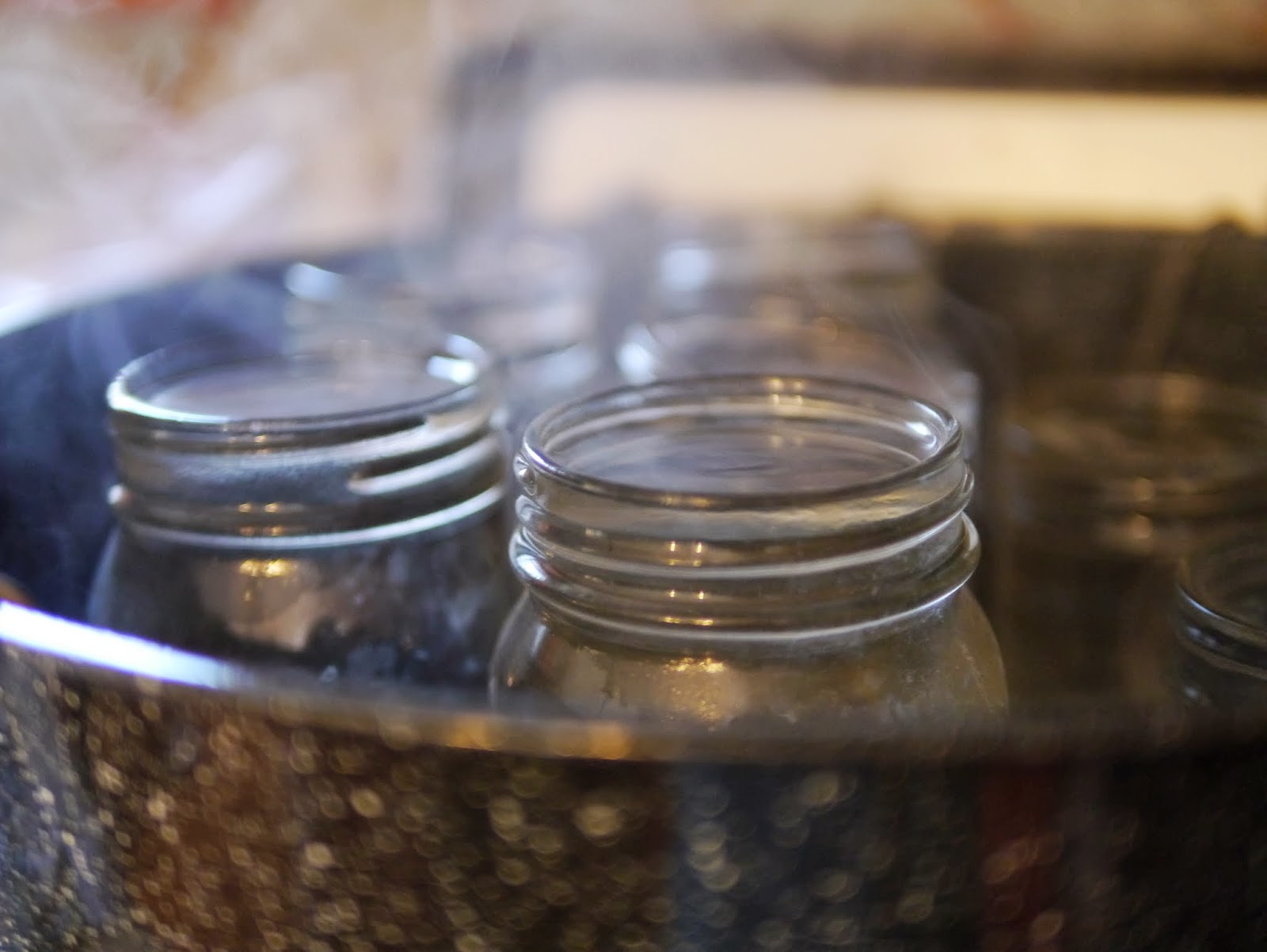 As the relish is simmering away, sterilize the pint or half-pint jars in the water bath canner. I do a combination of both sizes of jars. The pints I keep and the half-pints I give away as gifts. Leave the sterilized jars in the water bath canner until you need them. Also remember to prepare the lids.