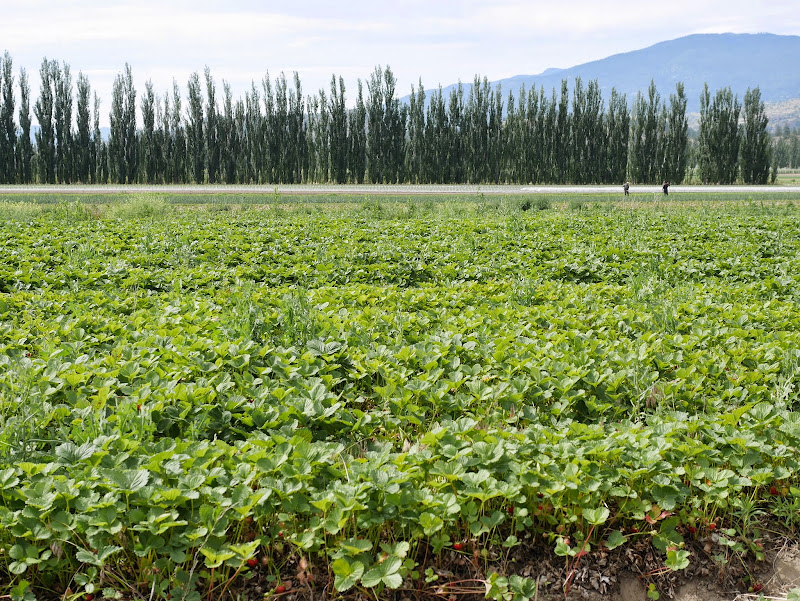 Today was our first u-pick day of the year. We started up at Covert Farms and picked their sweet organic strawberries ($2.50/lb). The picking was easy so it didn’t take long to fill our cardboard box. Teddy wasn’t too keen on standing between the rows of strawberry plants. Unfortunately he’s getting too heavy to have in carrier while picking, which is what I did last year, so I need to come up with some ideas for keeping him happy while we u-pick. I also made the poor choice of wearing shorts and a sleeveless shirt and got pricked by thorns and eaten by the mosquitoes. I hadn’t noticed many mosquitoes there last year but this is the earliest I’ve been out there to pick fruit. Next time I will take my cue from the farm workers and wear pants, a long sleeved shirt and boots. Actually, I should come up with a list of what to bring u-picking so I don’t forget anything next time.