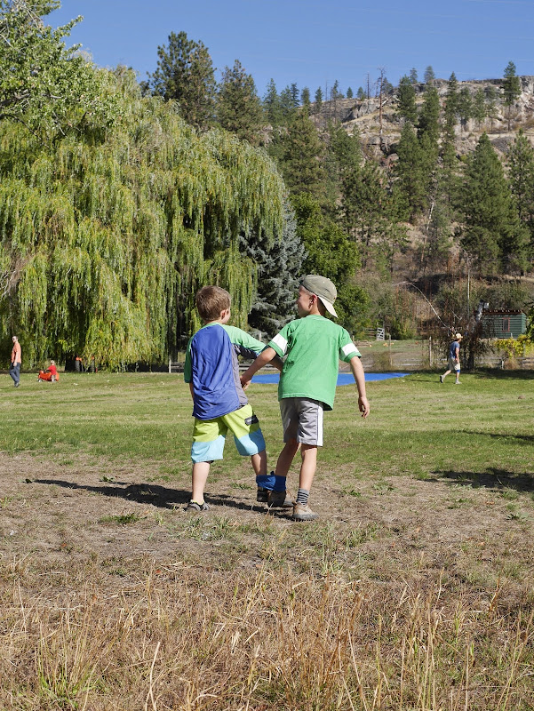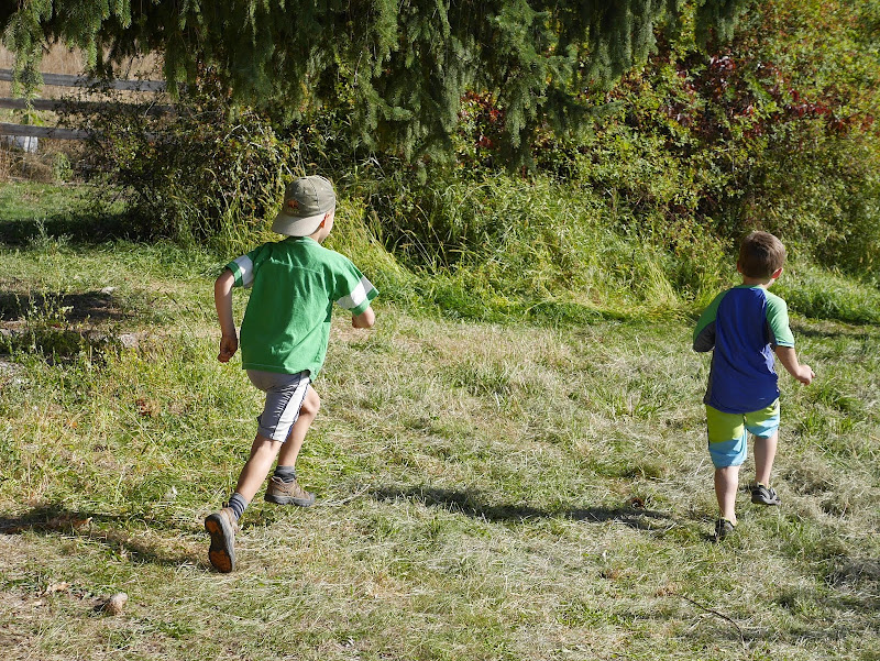 A couple weeks ago we participated in the Freakn’ Farmer up at Covert Farms, but today we took part in the FREEkn’ Farmer over at our friends’ farm. You see, the Freakn’ Farmer increased their child race admission prices considerably from last year and that dissuaded quite a few families in our group of friends from participating. Instead some of our friends planned their very own our farm obstacle race and appropriately named it the FREEKn’ Farmer (because it was free!)! I didn’t see the entire race but I can tell you that is started with a hilarious three legged race, was followed by intense wheelbarrow pushing and then there was lots of running through the farm. The children had to cross over a wicked mud pit and the race ended with a slip and slide. My children had great fun and after the race everyone enjoyed a feast of delicious fall inspired pies and lounged in the warm autumn sun. It was lovely day for fantastic fall festivities! (yay for alliterations!)