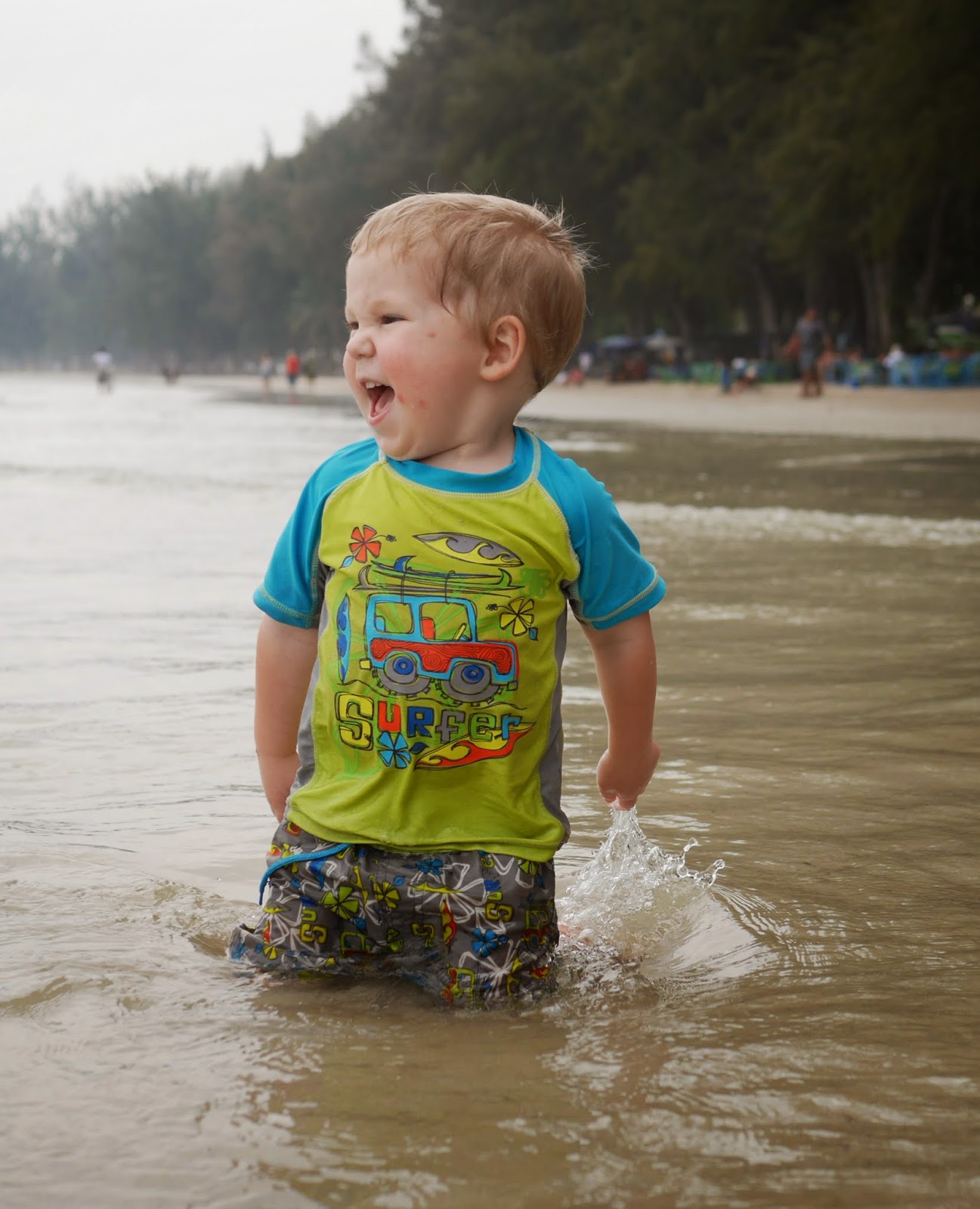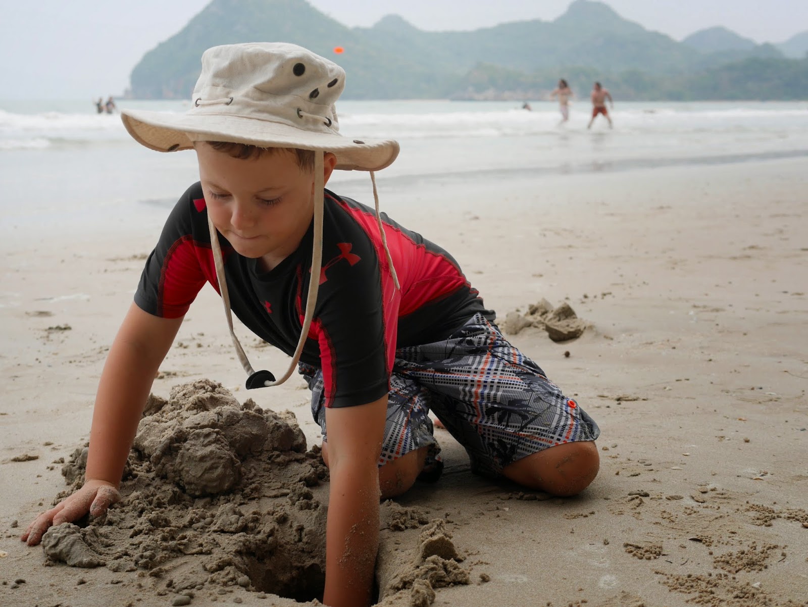 After solidifying travel plans there was much indecision around lunch. Today was our last day in Prachuap Kiri Khan and we were hoping to visit a great little restaurant just down the street from our hotel but it was closed. Finally we decided to return to Ao Manao beach and purchased some inexpensive food from their cafeteria. Our food was alright, nothing to rave about but sufficient enough to fill our bellies. We wandered out to the beach and the children immediately set to digging holes in the sand and riding waves which were bigger than yesterday’s. It was a relaxing afternoon albeit a bit cooler.