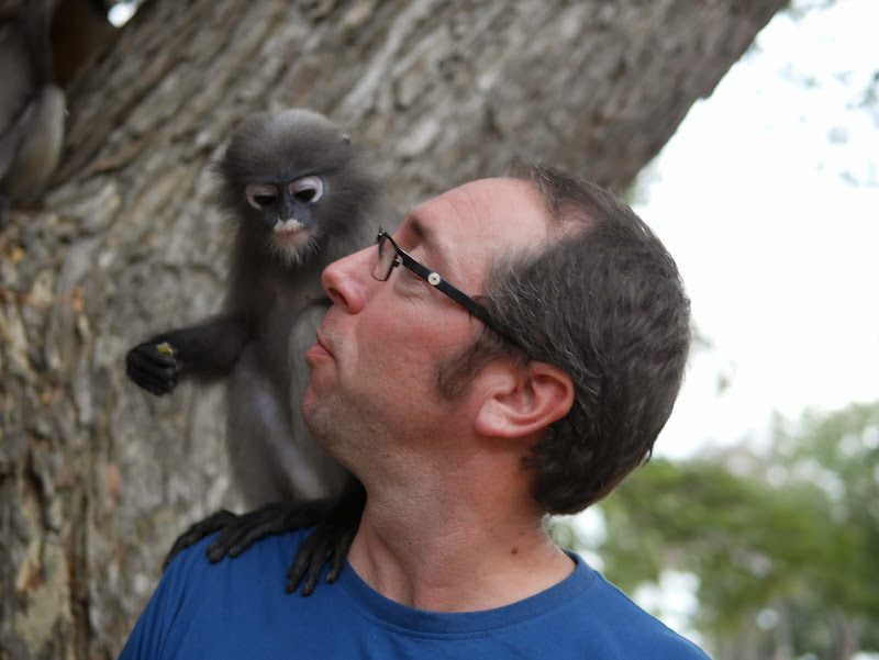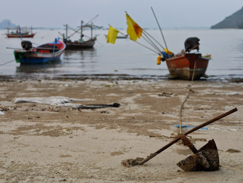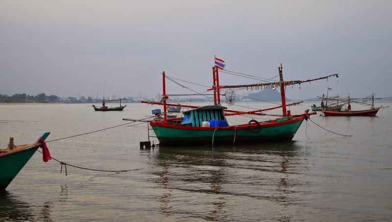 On our way back to O Bay Design Hotel we took a detour within the army base to visit a troop of languour monkeys. These monkeys are quite gentle in comparison to the aggressive macaques which tend to attack and steal anything they can get from you including your glasses. Languour monkeys will carefully take food from you and some can even be convinced to climb on your shoulder. As the children were captivated by these cute fuzzy creatures I wandered over to a nearby bay to look at some traditional Thai fishing boats. There was nobody around so I clambered through a rather polluted beach to snag a few pictures of these colourful vessels. Tomorrow we are leaving this charming town and driving south one last time.