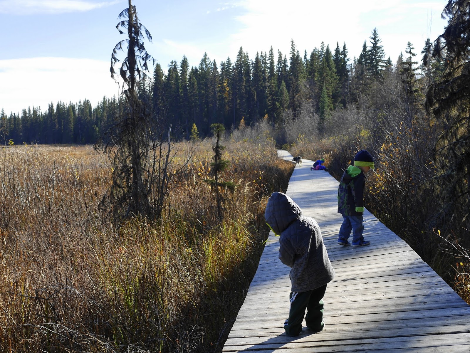 My children enjoys the diversity of the trail around the lake. With its boardwalks and bridges, muddy spots and root ridden areas it kept everyone interested and engaged. I would not recommend a standard stroller on the trail but it might be manageable for an all-terrain stroller. Also parts of the trail are in need of some repair. At least one boardwalk was rotting in places and others have nail protruding from them. I hope that the city of Prince George is able to maintain the trail so that it continues to be safe and accessible to big and little adventurers alike.