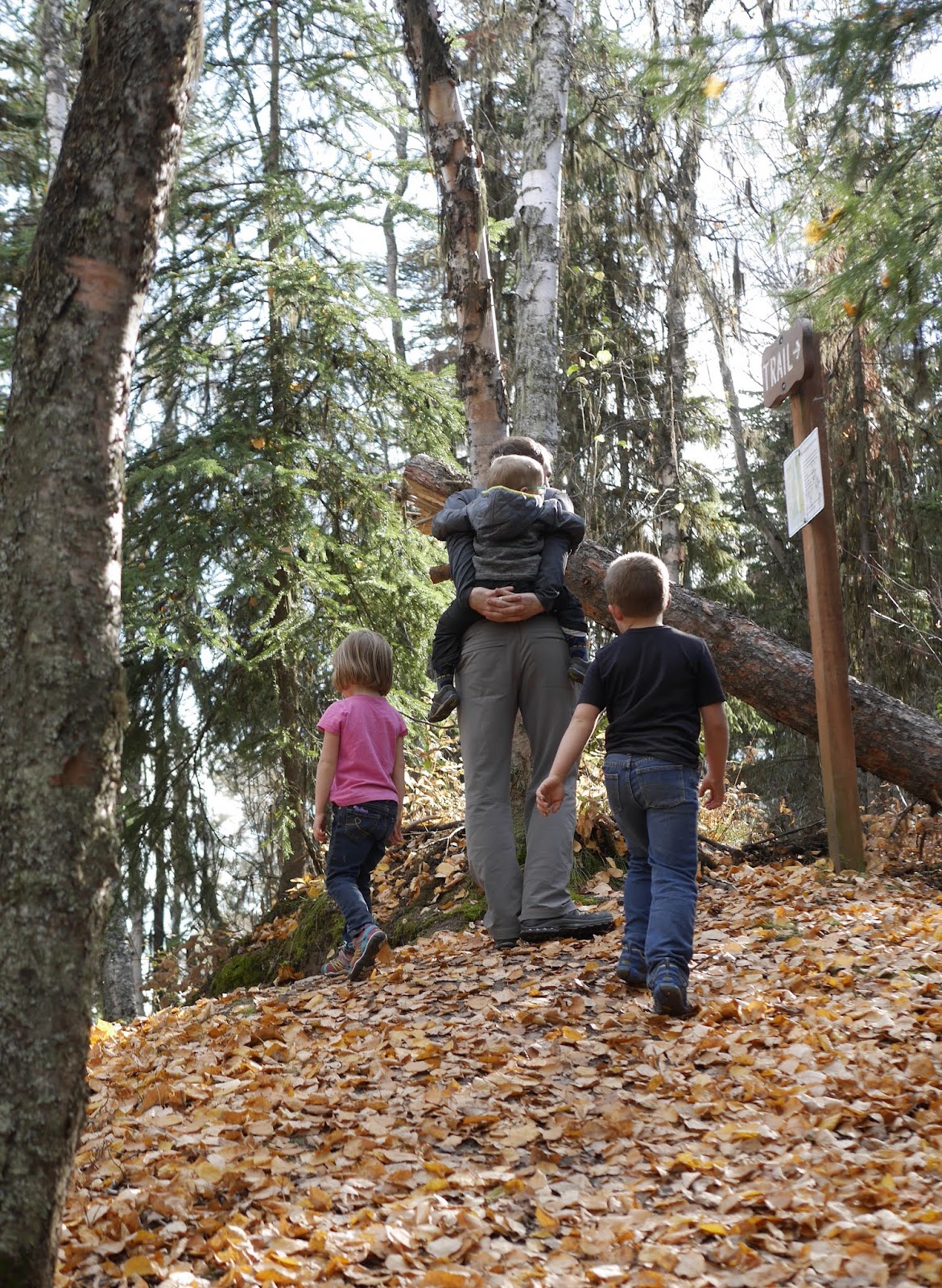 The next section of the trail we followed is located to the very right of the fenced area. It is an unmarked trail which is steep and hangs treacherously over the cutbank. If you choose this path, proceed with great caution! My eldest (seven) scrambled up without help, my daughter (five) managed well with the help of her uncle and my youngest (three) screamed the whole way up as he clung to my hands. Holding on to his hands gave me a significant disadvantage on the way up and there were a couple times I nearly lost my footing. After a decent scramble upwards we continued to follow the trail along the edge of the cutbank for a ways before veering right back into the forest. As we continued to follow the trail downhill it reached another fork, at this fork we went left, back towards the cutbanks. We hiked along the trail which returned to the edge of the cutbank and opened up to a steep slope that carved through the cutbank. What fun!