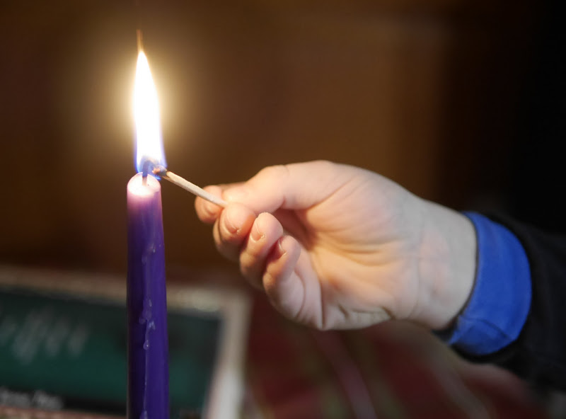 The Advent wreath, with its evergreen branches and four candles, three purple and one pink, is a reminder that Christmas is drawing near. We light the candles, one for each week of Advent, while we do our Jesse Tree Bible readings. The Advent wreath usually sits on our table, constantly shedding needles, which is also a good reminder that Christmas is getting closer.