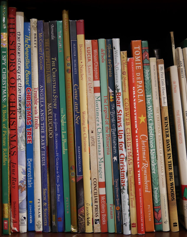 A few years ago we started the tradition of having an Advent book basket. I really enjoy books and have a particular weakness for picture books. Over the last years I have amassed a rather large collection of Christmas books so that they no longer fit into a basket. Now I fill an entire shelf of our living room bookcase and a basket. The first year we started this tradition I was inspired by Shower of Roses and wrapped one book for each day of Advent. The following year I opted out of this practice as I found it to be too time consuming and wasteful. Now we read one (or two…or five…or zero) of these books from the bookshelf everyday during Advent and we enjoy the freedom of choosing the books that interest us.
