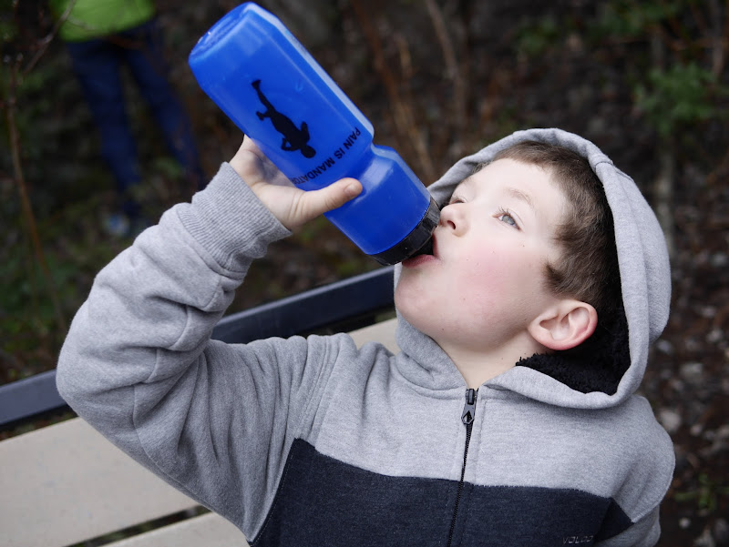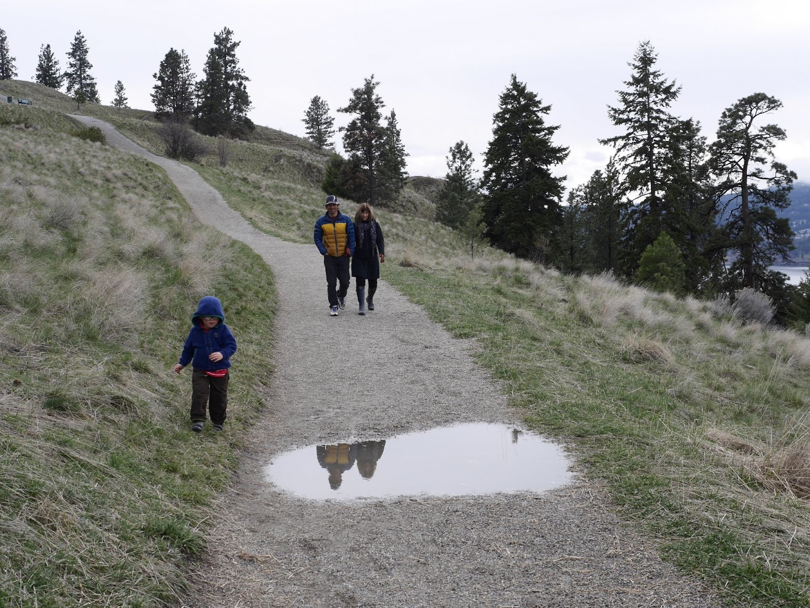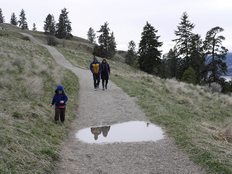 Despite a drizzly March afternoon we took our energy filled children to explore Knox Mountain (map), a 310 hectare park located north of downtown Kelowna. It was our first time hiking here and there are so many trails we did not know where to begin. We parked at the Lower Crown Lookout, the second parking lot, and started along Paul’s Tomb Trail.