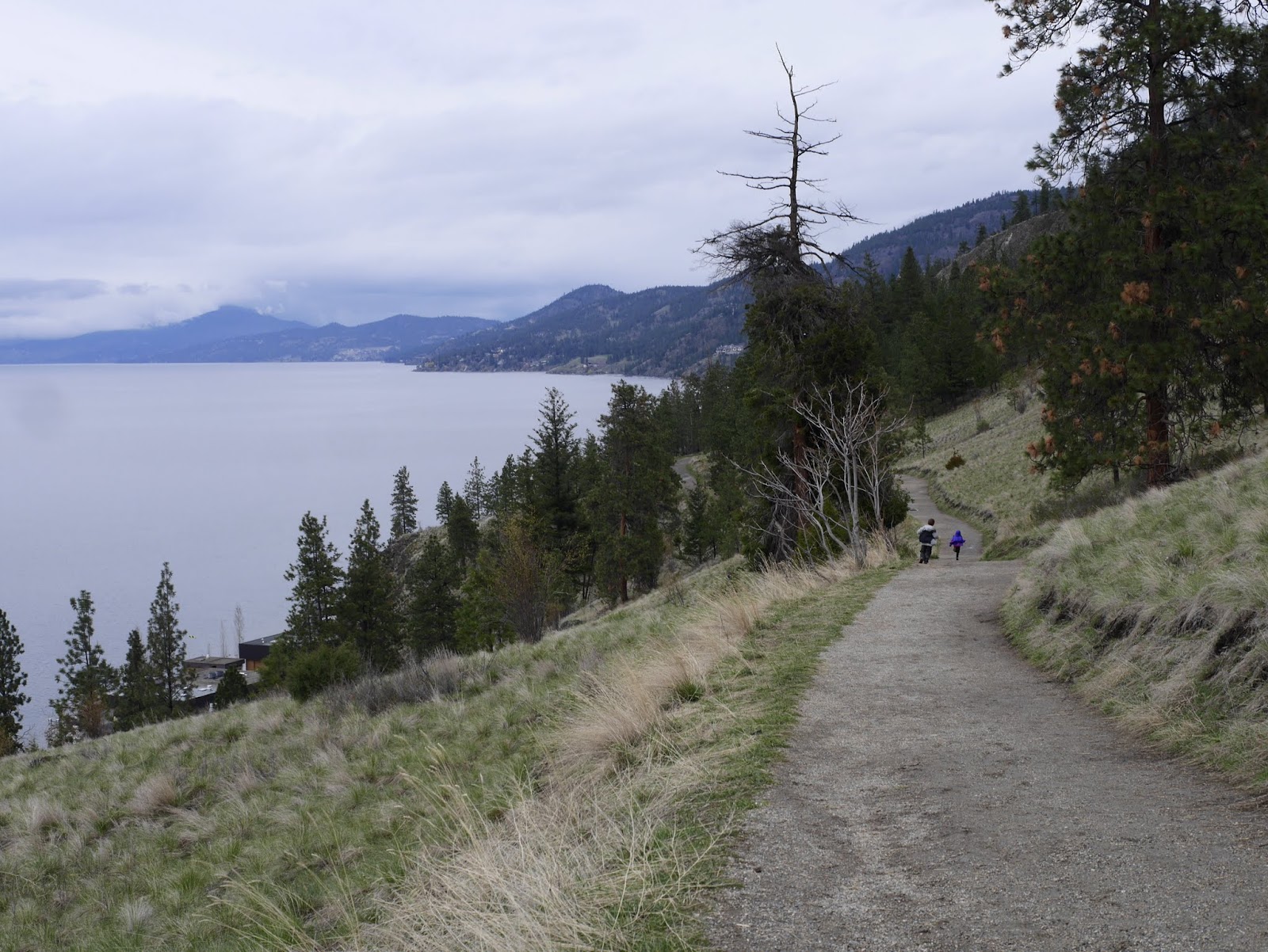 The hike back to the parking lot is a bit more arduous since it is an upward climb but there are plenty of benches along the way for resting. My youngest (a small four year old) did need a little help back partly because he expended a lot of energy searching for geocaches. Regardless, the heavy rain clouds and splattering rain kept everyone walking briskly and the return hike felt shorter than the hike out. The hike took two hours for us to complete. Like many trails in the Okanagan valley, the trail is exposed and so it would be quite hot in the summer. However, I would love to go back on a summer’s eve and swim in the cove.
