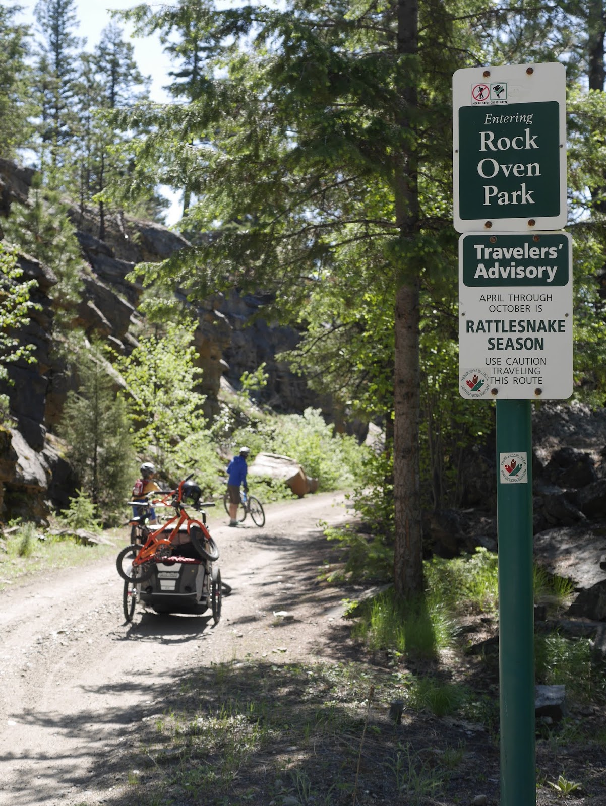 Forty-three kilometers (43 km) sounds like a long way for a family bike ride and I was not sure how we would manage. What made the long ride not only possible but enjoyable is that the entire trail has a downhill slope ranging from 1.6 to 2.2%. My daughter (6) did struggle with the loose gravel and sand and spent most of the ride in the double Chariot with her brother (4). Next time I would consider using a Trail-a-Bike for her. My eldest (8) rode the whole trail without a single complaint – what a trooper! Pulling the double Chariot behind my bike worked really well except for a few sandy spot but they were minor. From start to finish it took us five-an-half hours and that included plenty of time for breaks and exploring.