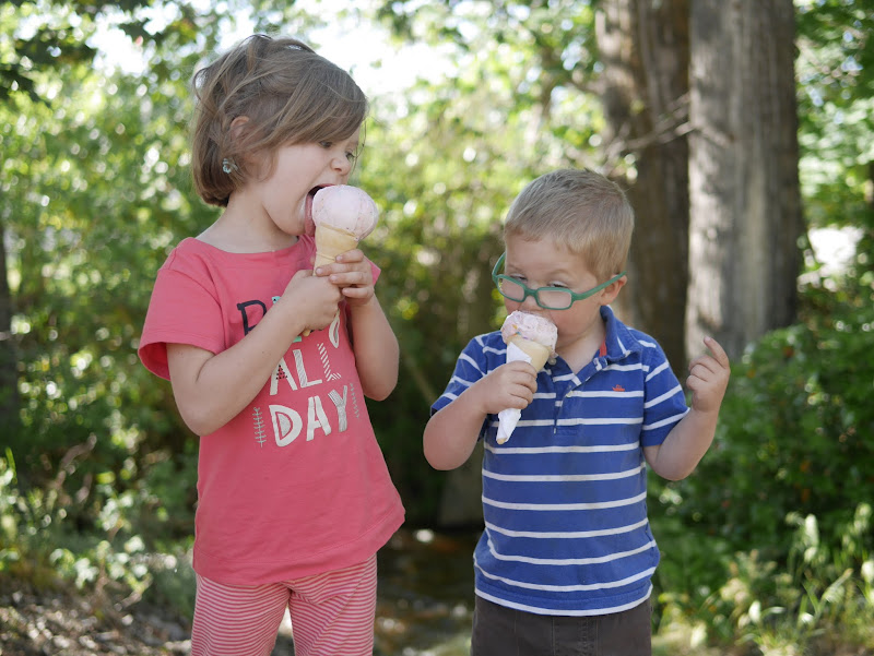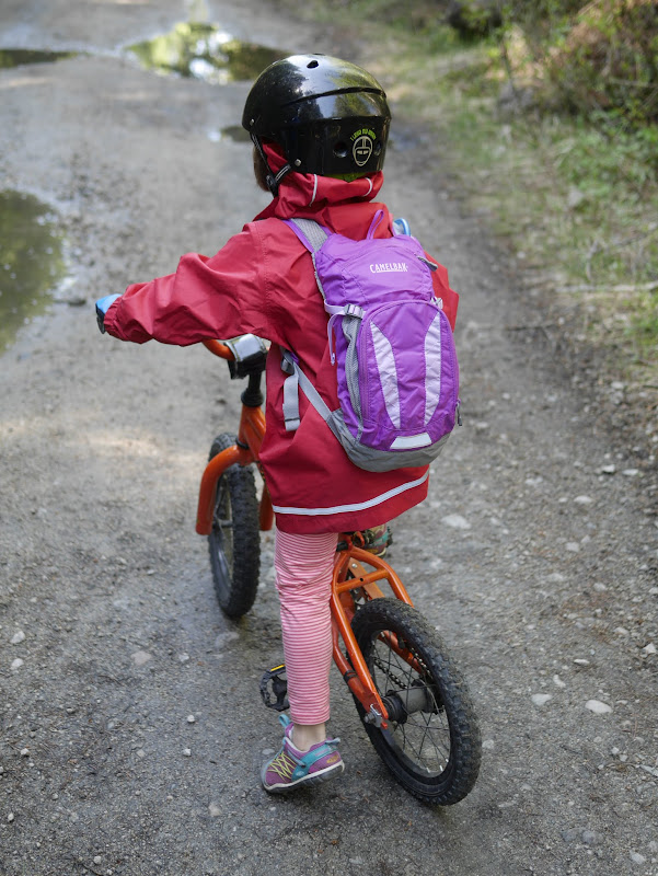 We started our ride from Chute Lake at eleven in the morning (on May 5th). It was a bit chilly at first and we were grateful to have raincoats. The first portion of the KVR trail crosses several little bridges over Chute Creek. The trail was rocky with a few puddles and some sandy spots. My daughter struggled through it and eventually chose to sit in the Chariot with her younger brother.
