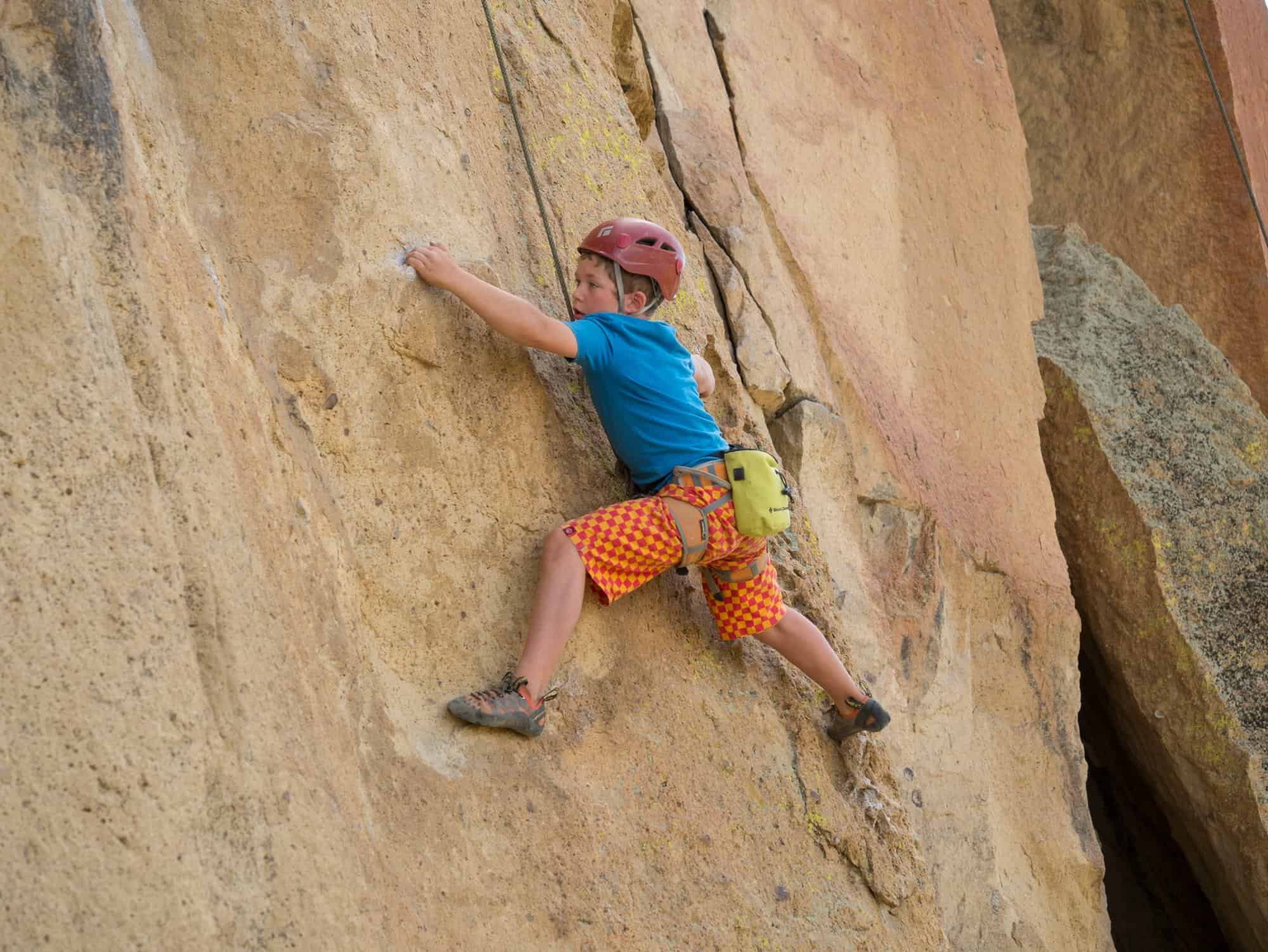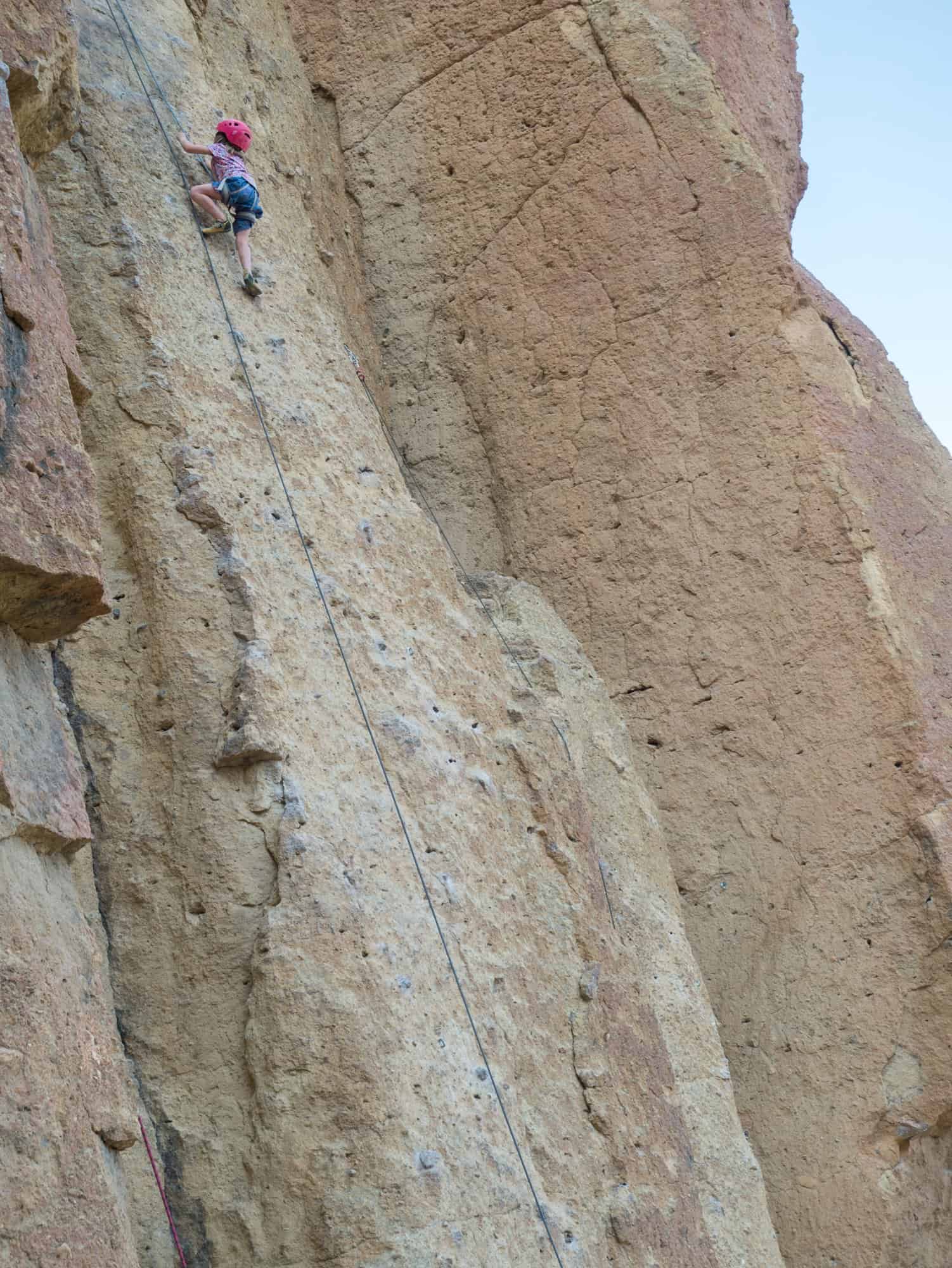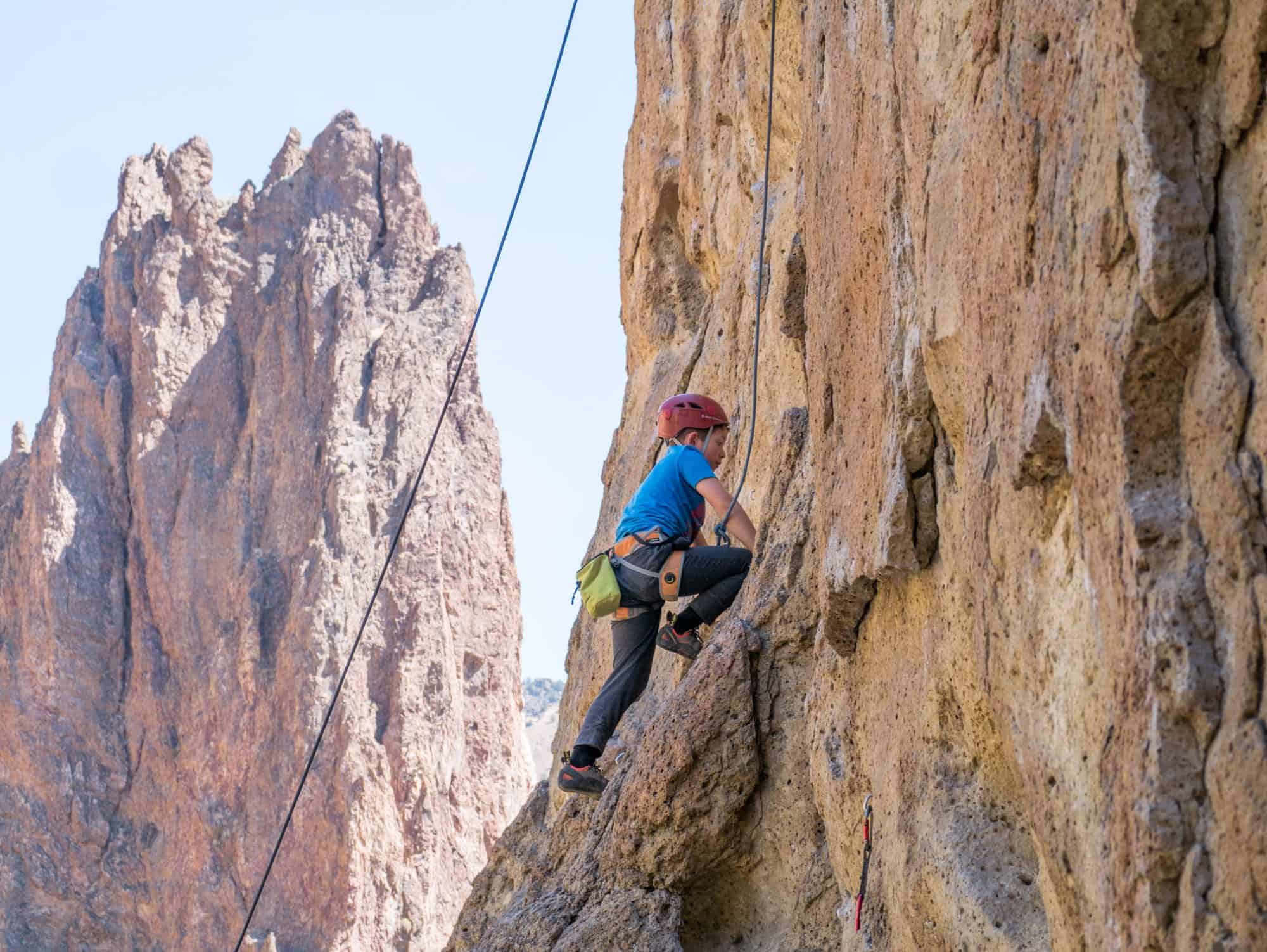 Apart from the regular gear you will need to climb, kids should have their own properly fitted climbing helmets (one helmet per kid), harness and shoes. While rock fall isn’t a huge concern at Smith Rock it can still happen. A stick clip is also highly recommended because some of the first bolts are quite high up.