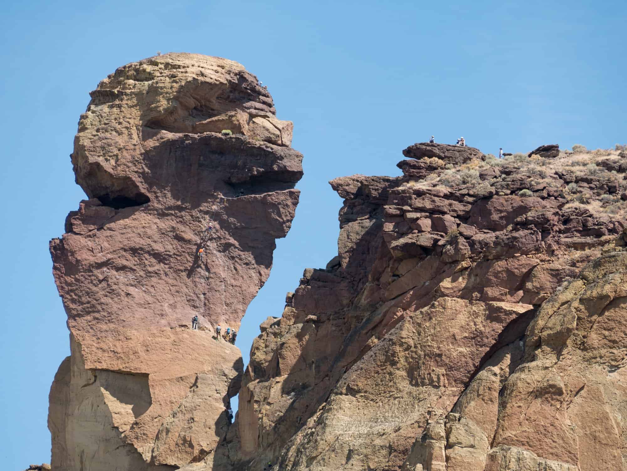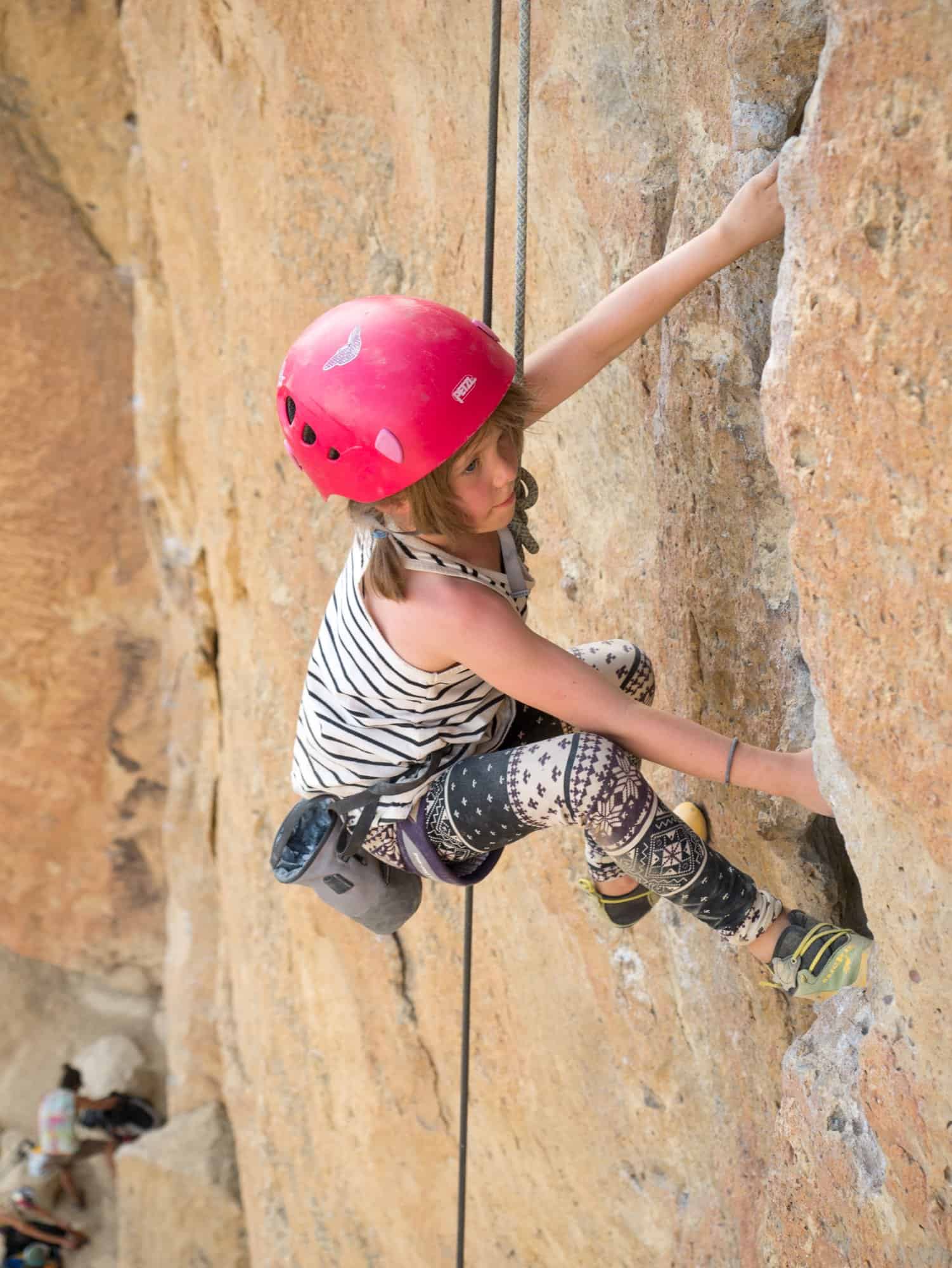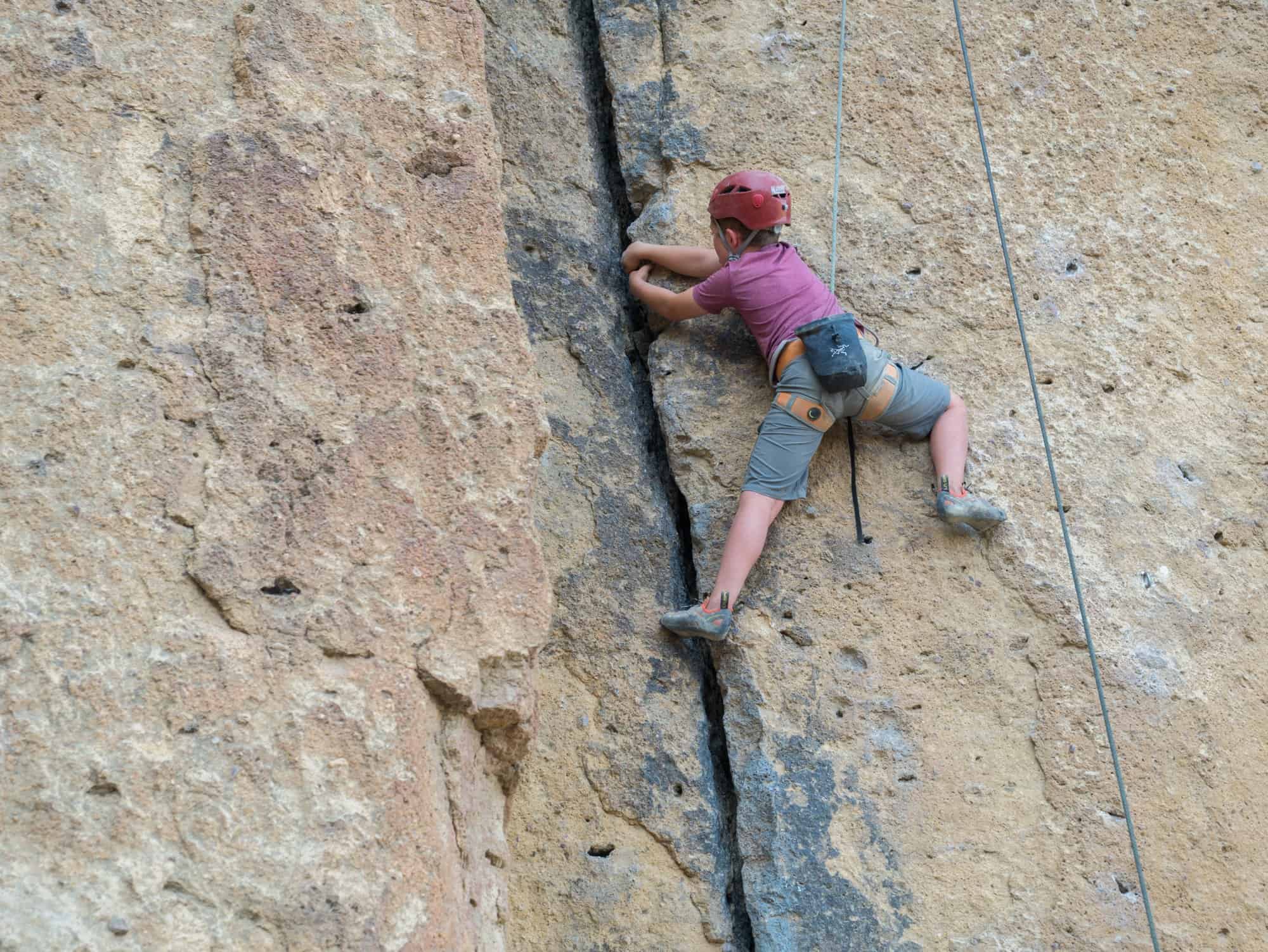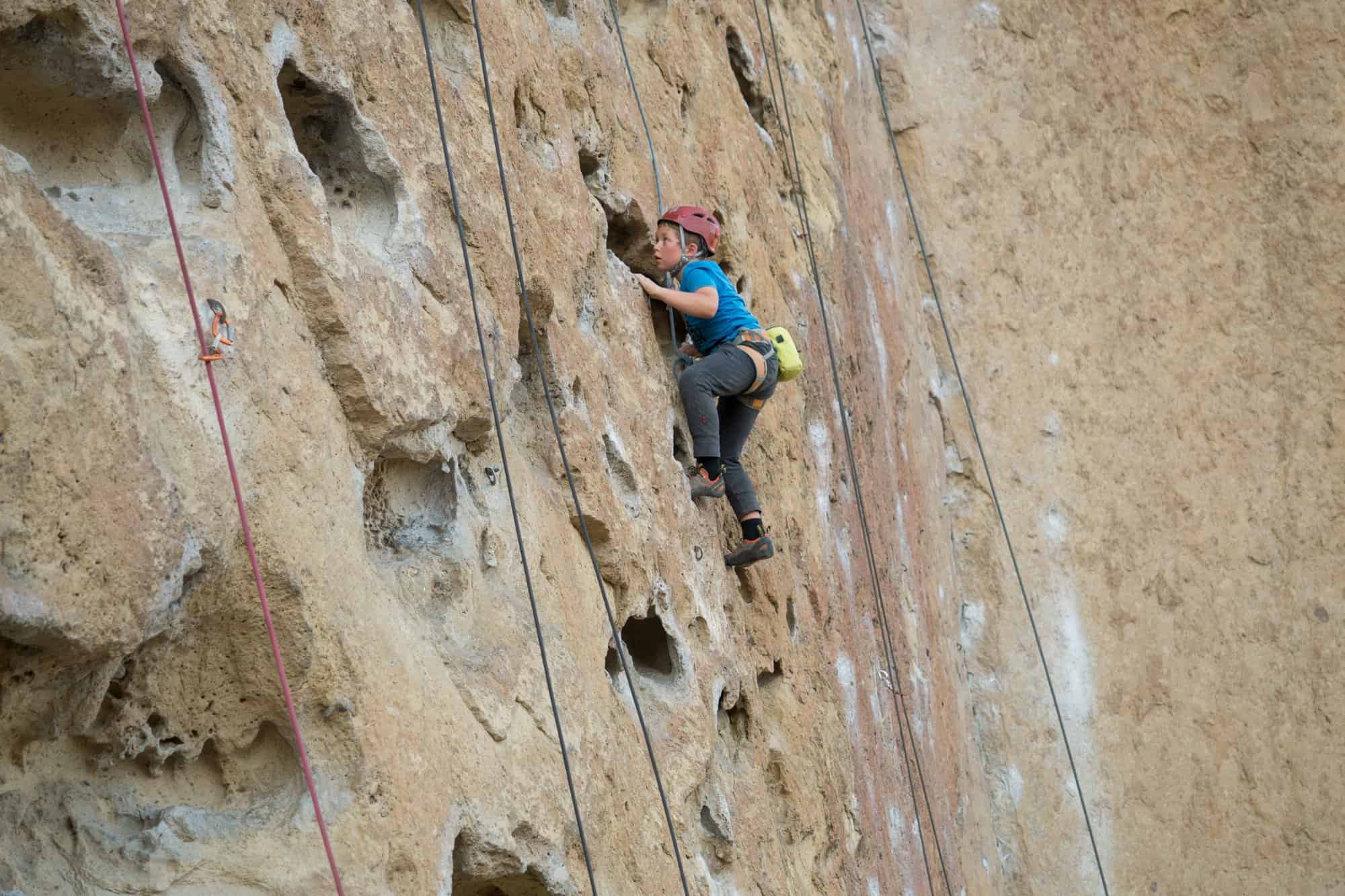 Apart from the regular gear you will need to climb, kids should have their own properly fitted climbing helmets (one helmet per kid), harness and shoes. While rock fall isn’t a huge concern at Smith Rock it can still happen. A stick clip is also highly recommended because some of the first bolts are quite high up.