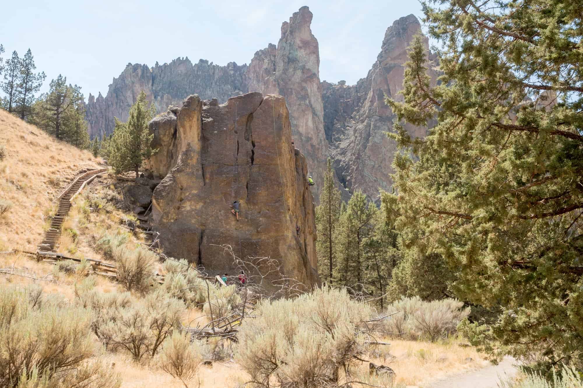 There are so many places to climb at Smith Rock; it can be really overwhelming! Below I’ve listed three places that our family enjoyed climbing at Smith Rock. These three areas have easier climbs, easy approaches and relatively safe landing areas.