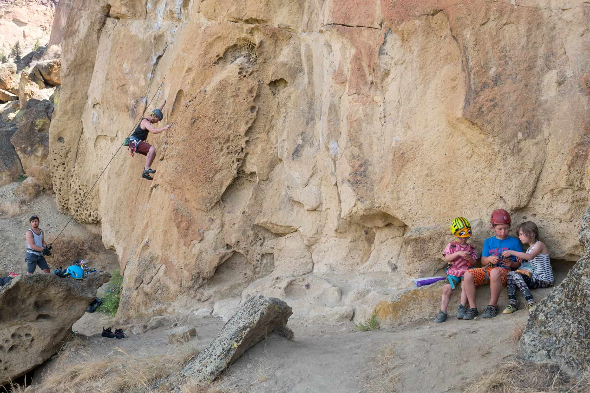 Specific skills and gear are necessary to rock climb safely with kids. If you’re new to climbing and interested in taking your kids out I recommend reading: A Beginner’s Guide to Learning How To Rock Climb with Kids. Another option is contacting Smith Rock Climbing School and taking a Family Rock Climbing Course.