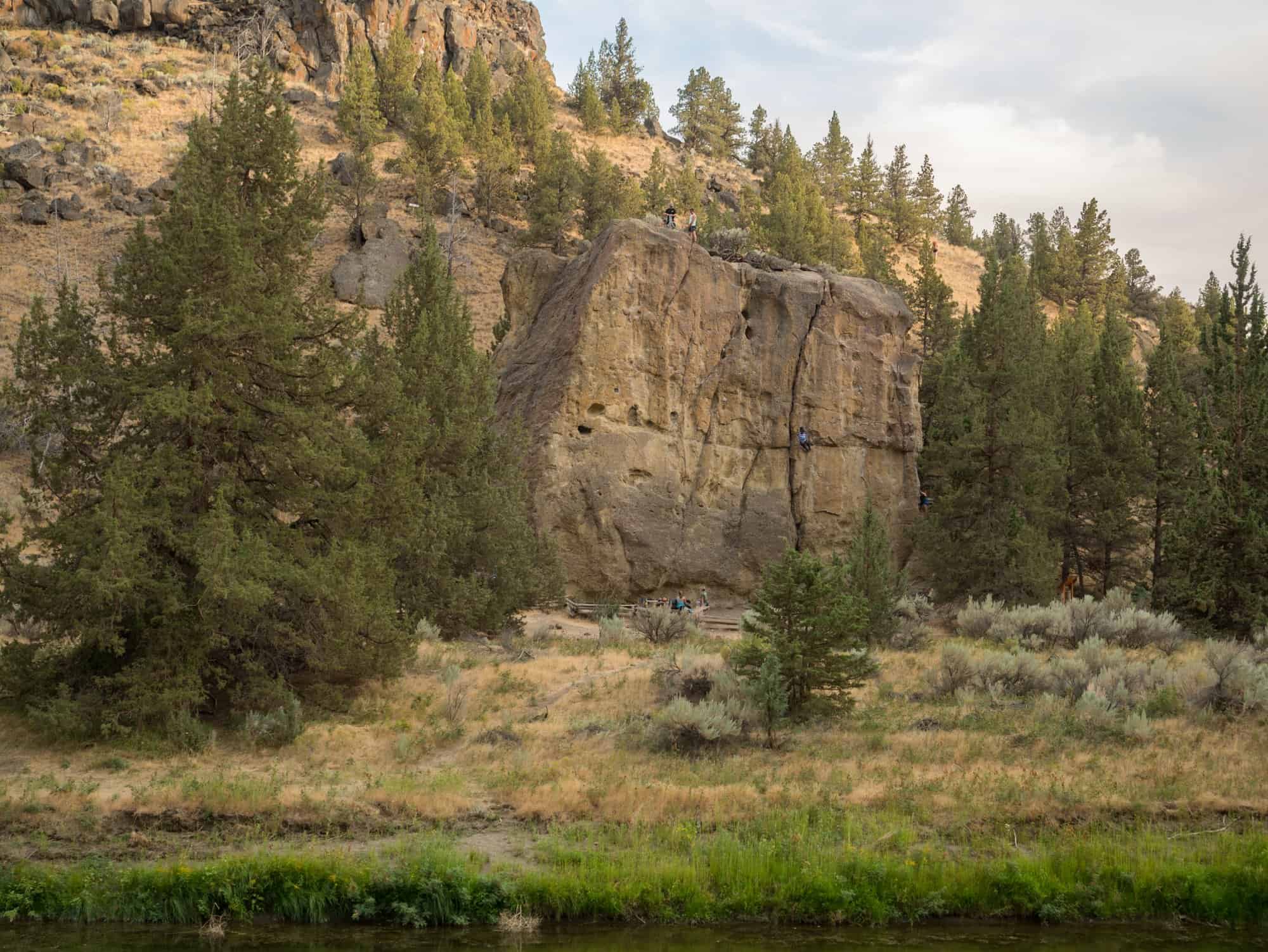 If you’re climbing with kids at Smith Rock, Rope de Dope Rock is a great first stop. This square rock sits across the river from Morning Glory Wall and is shaded until the mid-afternoon. The approach is quick and easy and there’s a nice wide landing with picnic tables. There’s about ten easy to moderate bolted routes on this rock (from 5.7 to 5.10b) making this a fun spot for the whole family.